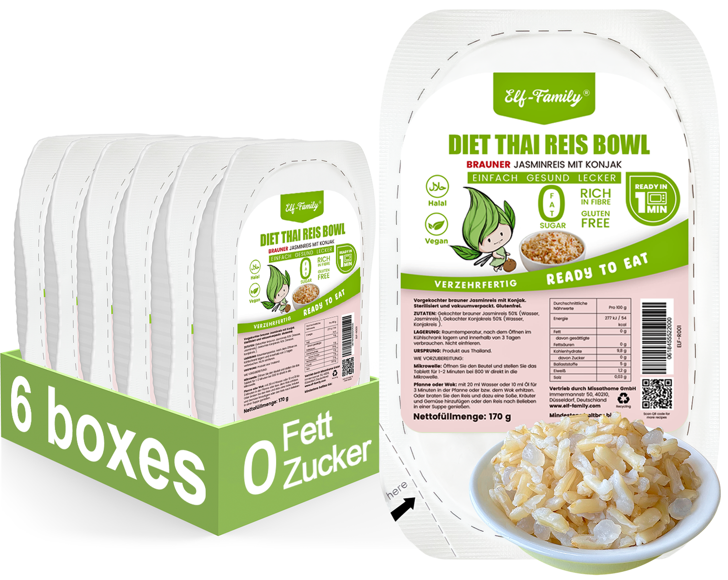 Elf-Family 170g x 6er Pack Low Carb Diät Box für 1 Woche | Brauner Jasminreis Konjak Reis Poke Bowl - für Vegan Diät, Ketogene Ernährung MHD: 07/11/2026 1.02 kg